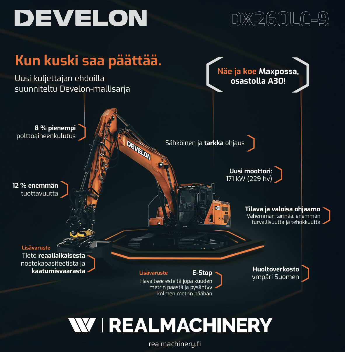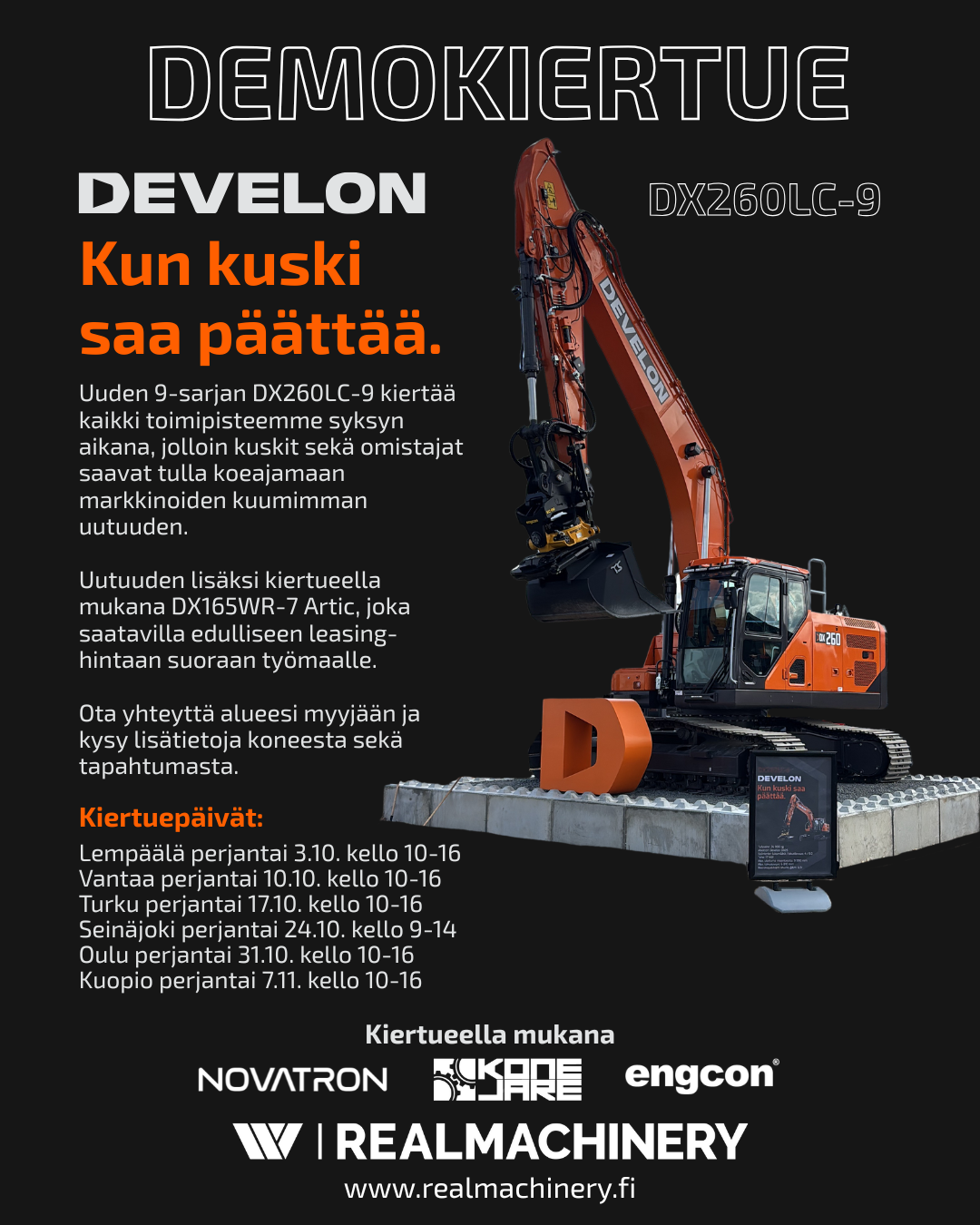 Teho, tarkkuus ja käyttömukavuus – kaikki yhdessä paketissa. RealMachineryn demokiertue tuo uuden Develon DX260LC-9 -mallin lähelle sinua.